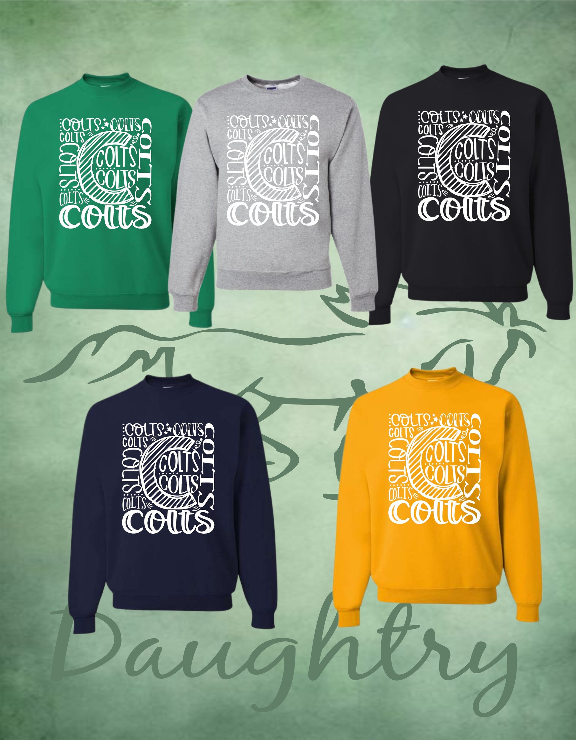Show your school spirit boldly with the Colts Crewneck. Designed for comfort and style, this shirt lets you wear your pride proudly! This shirt is a must-have addition to your spiritwear collection. Support your school, a portion of proceeds goes to PTO.